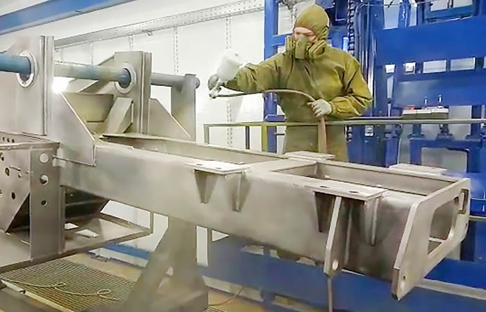 Линия оснащена современным оборудованием ведущих производителей. Крупные металлоконструкции проходят дробеструйную обработку, мелкие и небольшие детали – мойку с одновременным аморфным фосфатированием в аппарате химической подготовки поверхности.