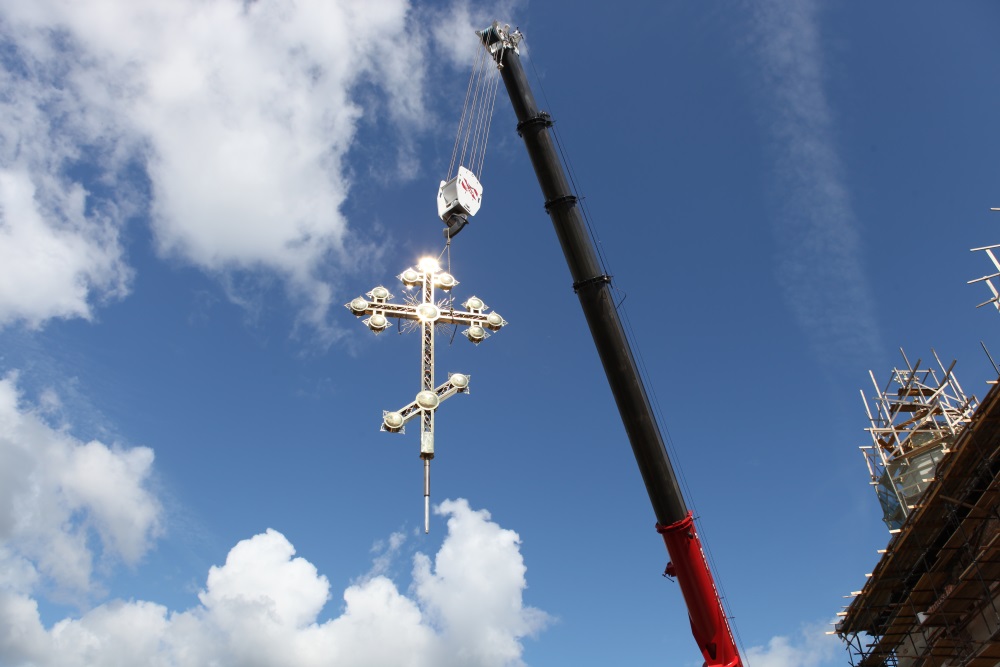 Непростой подъем осуществлен мощным и надежным автокраном «Галичанин». На кровле принимали ценный (правильнее, конечно, бесценный) груз специалисты подрядной организации «ЛАЙМ -ПАРК».