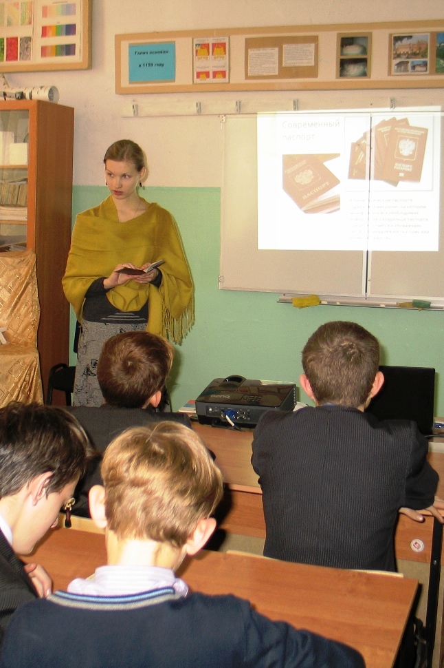 «Читайте, завидуйте, я — гражданин Советского Союза», — писал в далеком 1929 году В. В. Маяковский. Испытывают ли современные ребята подобную гордость, получая свой первый паспорт? Чтобы заставить юношество задуматься о приобретаемом правовом статусе и правильно оценить свой главный документ, сотрудники Городской библиотеки решили познакомить учащихся восьмых классов школы №2 и лицея №3 с историей паспорта.Современный российский паспорт сравнительно молод – ему всего 16 лет, но сколь трудный и долгий путь пришлось преодолеть документу, чтобы каждый гражданин РФ мог сейчас держать в руках эту «книжицу». Паспорт как пропуск и как удостоверение личности, в виде предмета одежды и на бумажном носителе, внутренние, заграничные, нансеновские и групповые, камуфляжные, фантастические – в каком только виде ни встречался этот документ на всем протяжении своего существования! Рассказ сопровождался слайд-презентацией. Кроме того, поговорили и о будущем паспорта. Вспомнили о правах и обязанностях, которые может осуществлять ребенок по мере взросления и получения основного государственного документа и о необходимых для этого правовых знаниях.