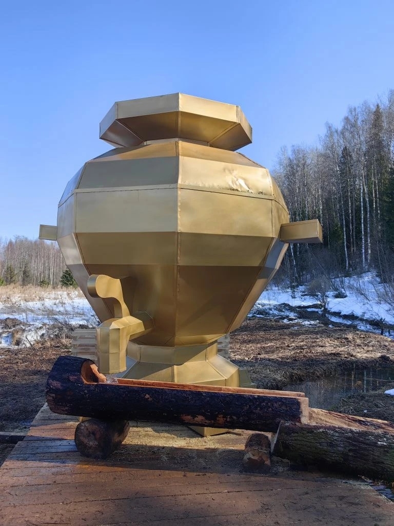 В Галиче появился трехметровый самовар! Стоит он, сияя золотыми боками на весеннем солнышке в Сказочном городке рядом с Шокшей по дороге в деревню Сипятрово.