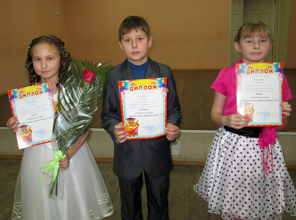 Почетное звание участник муниципального конкурса «Лучший ученик начальной школы 2014» получили: Шепеткин Кирилл из Пронинской школы, Голубев Даниил из Курьяновской школы, Попова Карина из Россоловской школы, Батова Анастасия из Красильниковской школы, Табакова Дарья из Лопаревской школы