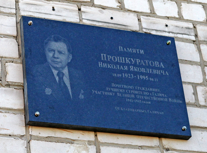 С именем Николая Прошкуратова, тесно связана история развития и строительства современного Галича. Привычный для нас вид с пятиэтажными домами и доступной инфраструктурой - детскими садами, школами и магазинами - новый район города приобрел благодаря строительству под руководством Николая Яковлевича, работавшего начальником ПМК-227. «Исключительно замечательный руководитель был. Грамотный строитель, человек слова и дела. Строгий, но справедливый. Его уважали, но иногда и побаивались. Хватало даже одного взгляда!» - так отзывались о нем бывшие коллеги, проработавшие под руководством Николая Яковлевича долгие годы. Дань памяти Николаю Прошкуратову не случайно было решено отдать именно в предпраздничные майские дни.