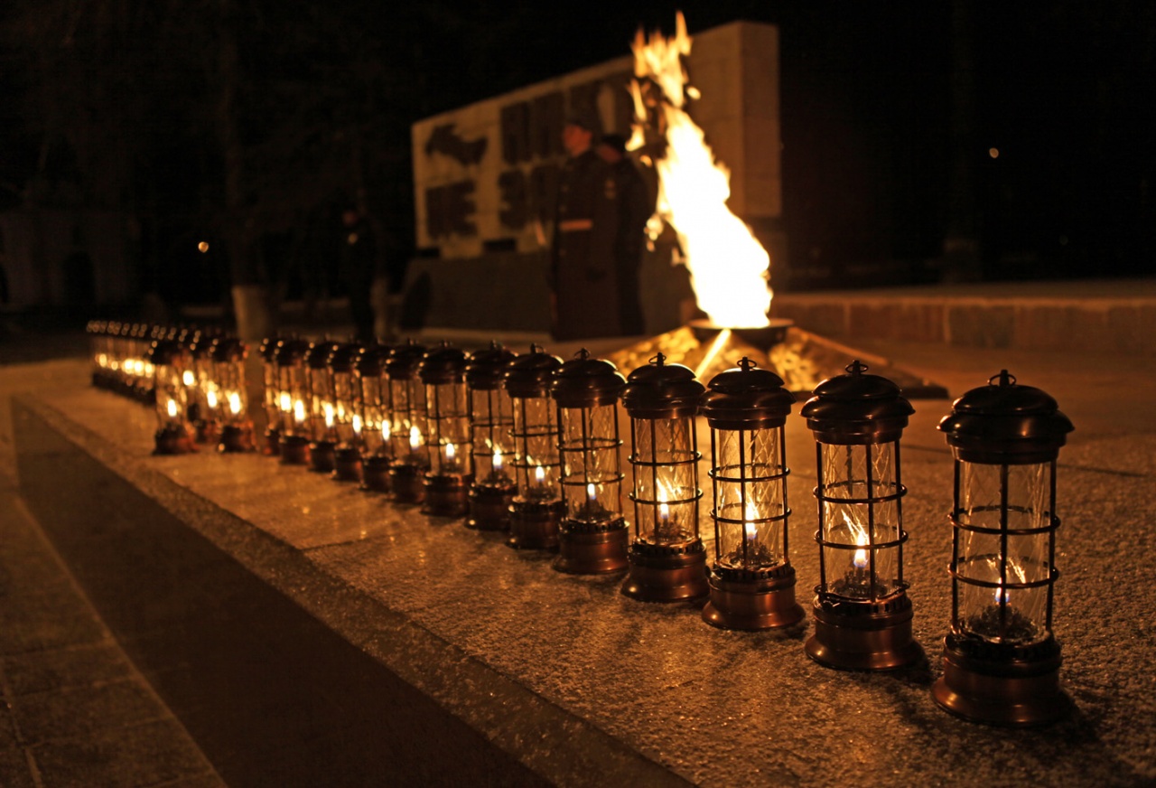 Почётный караул. Тишина ночного мирного города. Священный Вечный огонь. Темноту разрезают огненные блики – горящее слово «ПОМНИМ» у мемориала видно далеко вокруг. В каждой из маленьких лампадок – частичка Вечного огня.