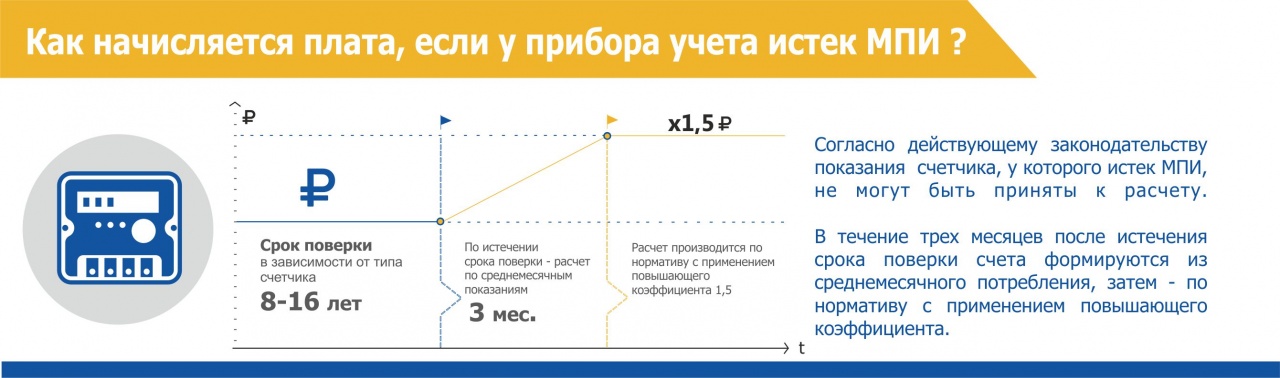 Прибор с истекшим межповерочным интервалом подлежит новому освидетельствованию (поверке). Поверка прибора является платной процедурой, в результате которой может выясниться, что прибор всё равно нужно заменить. Проще, а возможно и дешевле, установить новый более современный прибор учета.