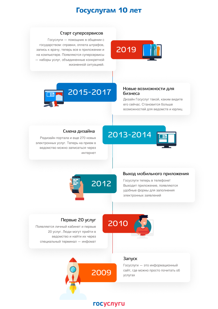 Единому порталу госуслуг исполнилось10 лет. 15 декабря 2009 года, в деньофициального открытия,на портале была размещена информация о 110 услугах федерального и более 200— регионального и муниципального уровней.Сегодня на портале госуслуг доступно свыше 29 тыс. сервисов в электронном виде.