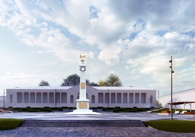 Второй проект – это проект современной стелы, она более «легкая», возвышенная. На ней также располагаются барельефы, герб, часы и ладья. Меняется только форма стелы.