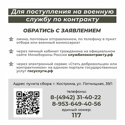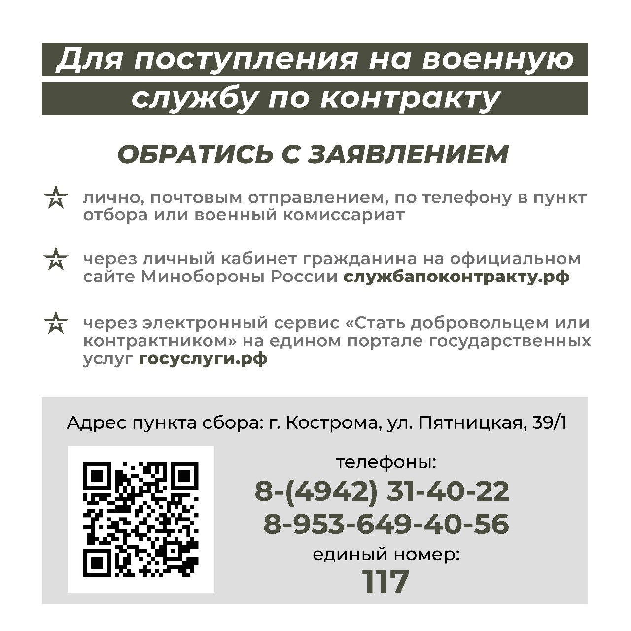 Написать заявление на службу по контракту можно через Госуслуги, в военном комиссариате по месту проживания, непосредственно в пункте отбора контрактников (Кострома, ул. Пятницкая, д. 39/1), МФЦ или службе занятости, а также обратившись в органы местного самоуправления. Дополнительную информацию можно получить по единому номеру телефона 117 или на сайте службапоконтракту.рф.