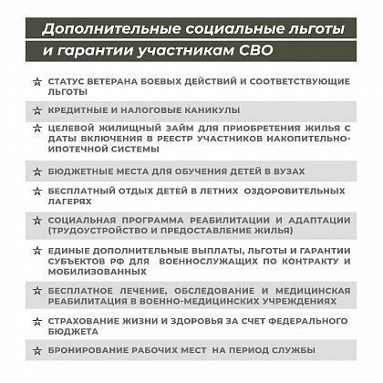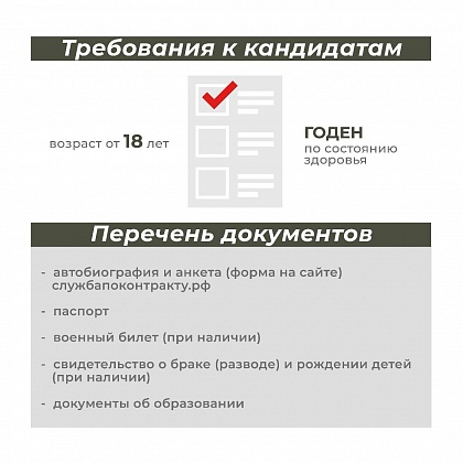 Нашей стране как никогда нужны защитники Отечества . Сейчас очень многие мужчины выбирают службу по контракту.Этот выбор достоин высокого уважения. Мужчины разных возрастов приходят в военный комиссариат, желая служить Отечеству, оказать помощь армии и государству. Военнослужащий по контракту — это защитник Родины. Его служба — это возможность осознанно и профессионально выполнить свой долг. Для контрактников предусмотрены льготы и гарантии как на региональном, так и на федеральном уровнях. Служба по контракту — это достойная зарплата, государственное обеспечение, возможность получения собственного жилья и другие меры поддержки.