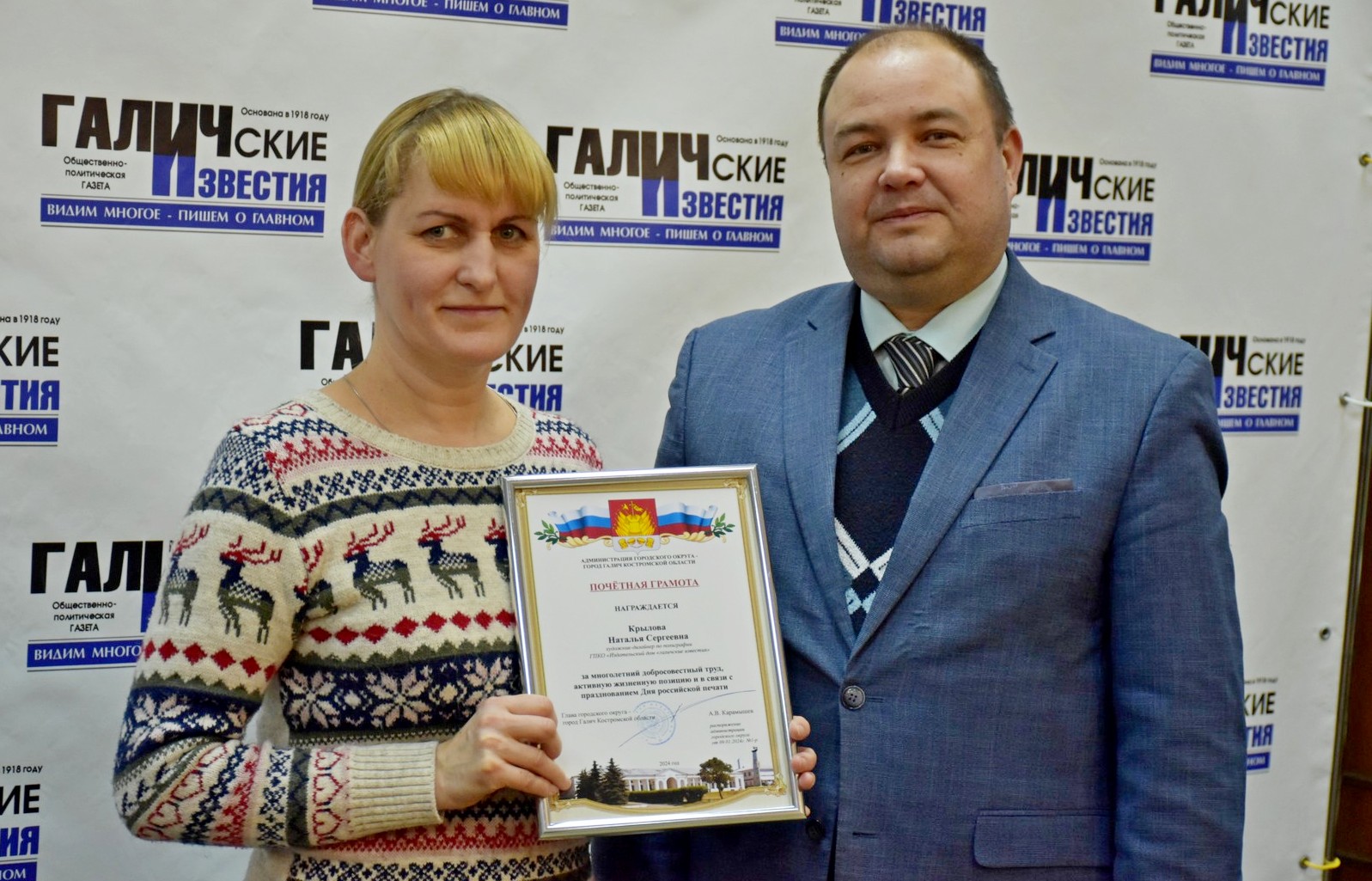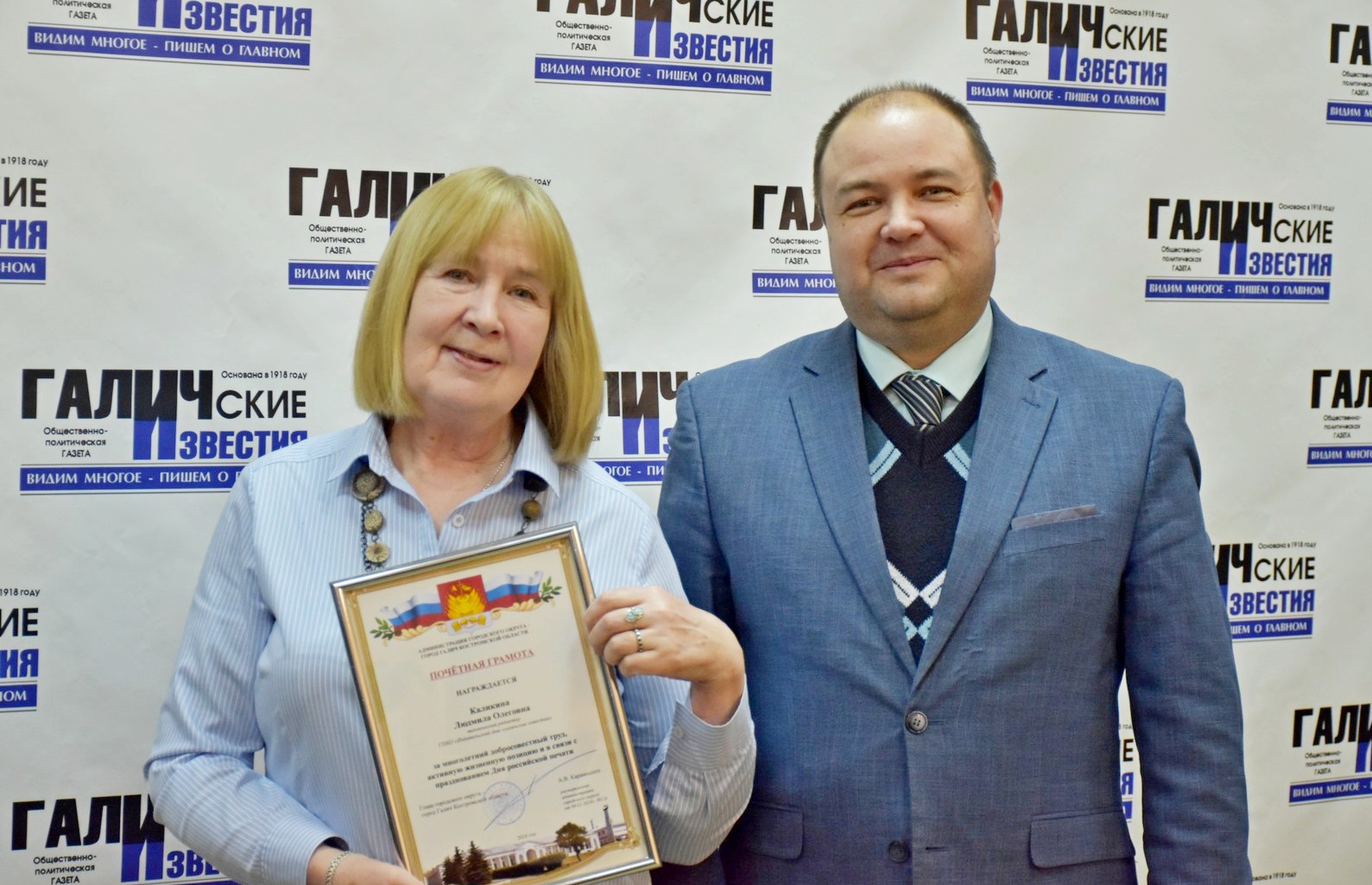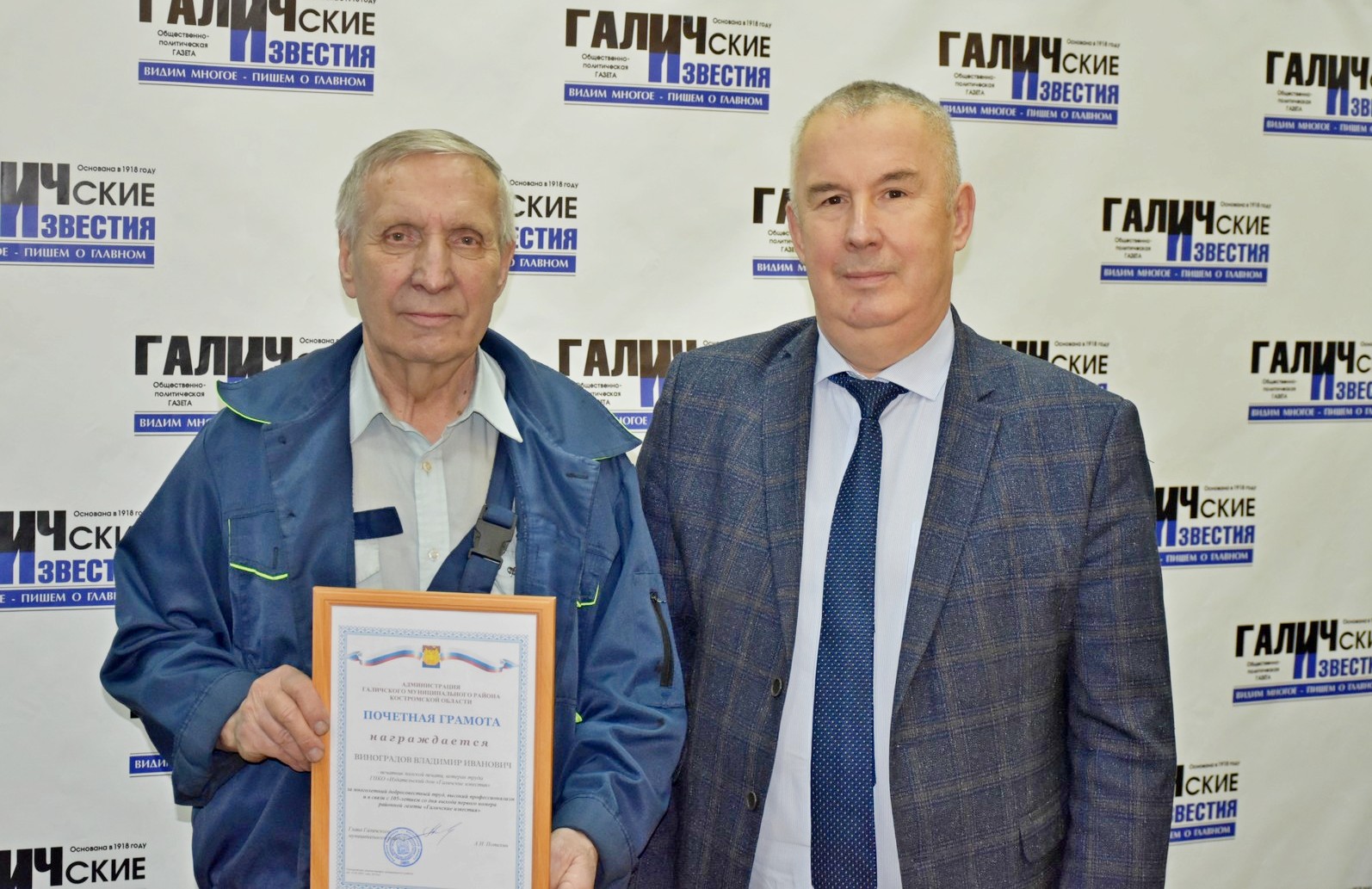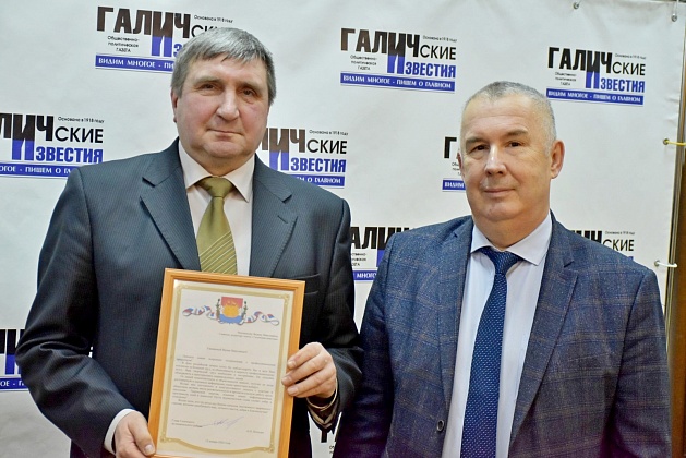 Поздравить коллектив редакции и типографии Издательского дома Галичские известия с наступающим профессиональным праздником - Днем российской печати и со 105-летием газеты "Галичские известия" пришли глава городского округа город Галич Алексей Карамышев и глава администрации Галичского муниципального района Александр Потехин. Они вручили почетные грамоты действующим работникам и уже ушедшим на заслуженный отдых - ветеранам труда, отдавшим многие годы своей жизни работе в средствах массовой информации. Десятилетия их трудом создавалась и распространялась газета для населения Галичского края и всех близлежащих районов. Весь непрерывный процесс шел изо дня в день и тысячи газет отпечатывались и вовремя доставлялись своим подписчикам. Спасибо Вам за этот нелегкий и каждодневный труд!