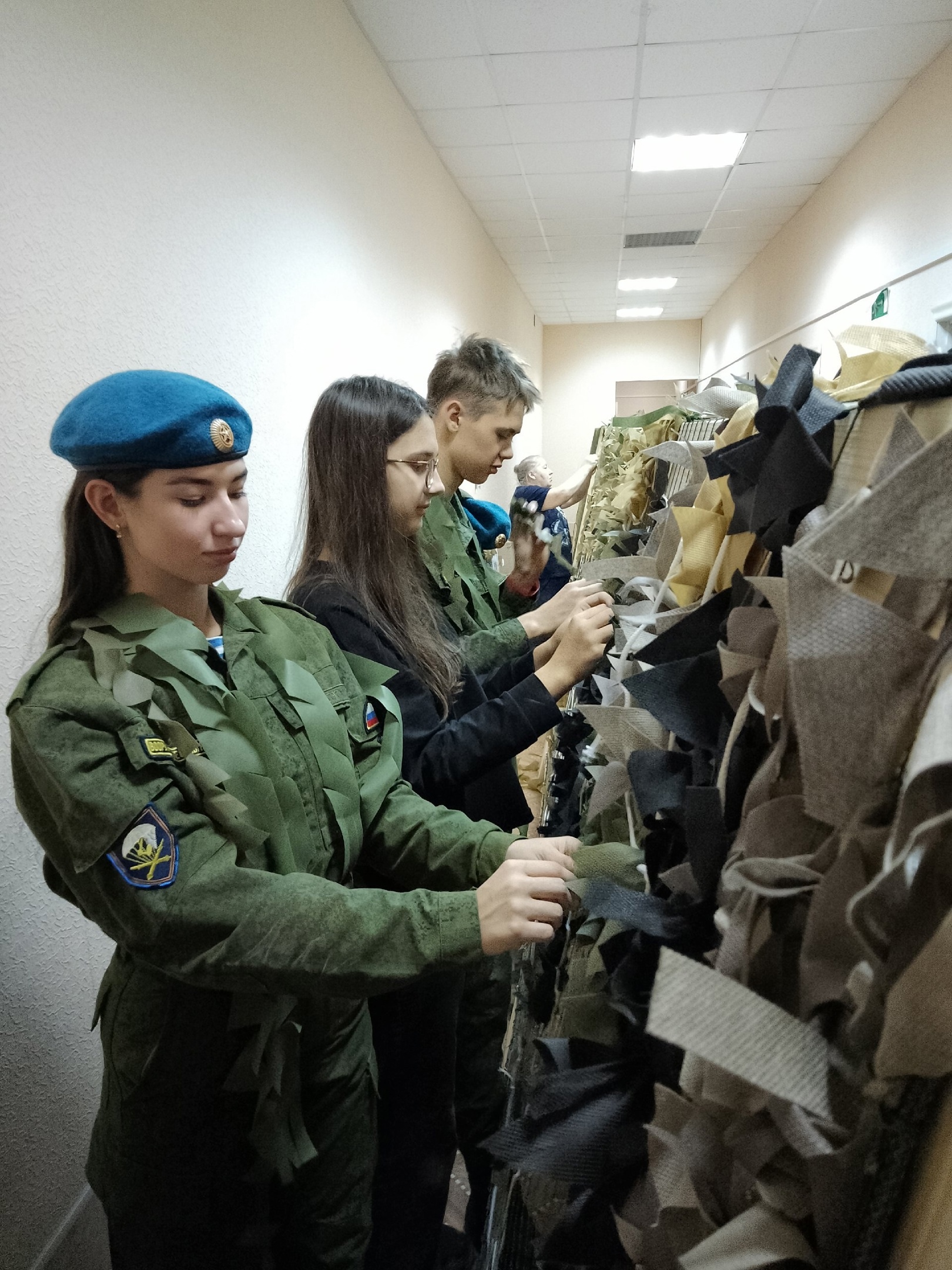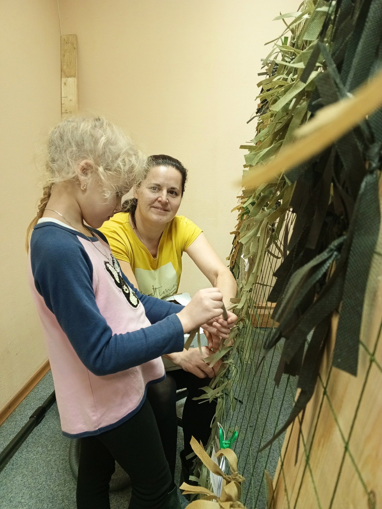 За это время ZoV приобрел верных своих помощников. Об этой группе организаторы говорят с особой теплотой. Их история началась в первый день осенних каникул, с обращения классного руководителя прийти и помочь, кто сможет. Пришли десять лицеистов из 7А класса вместе с Ольгой Владимировной Шикаловой, своей классной (на фото внизу). Большинство детей появились здесь и на следующий день, уже самостоятельно. Здесь их теперь знают и им доверяют. «Их не нужно проверять, они теперь у нас сами могут кого хочешь научить. Ребята очень качественно плетут. Мало того, что сами приходят почти каждый день, так они еще и своих братьев и сестер приводят», - хвалит лицеистов организатор Людмила Скворцова.
