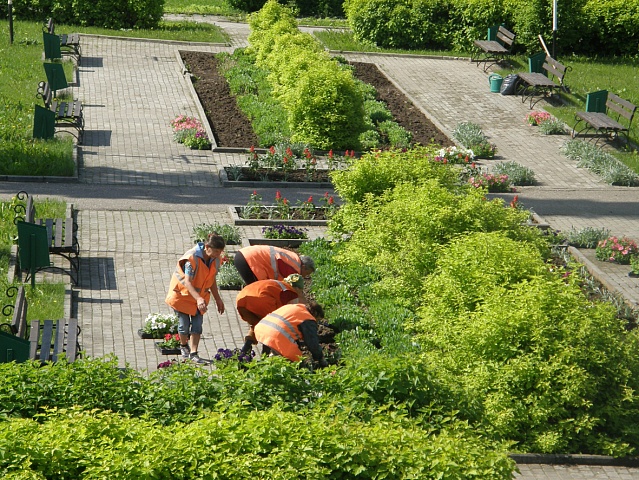 Рассада очень хорошего качества поступила из теплиц Высоково. Сажают цветы работники ООО «Благоустройство города». Принимают участие в посадке и сотрудники администрации города.