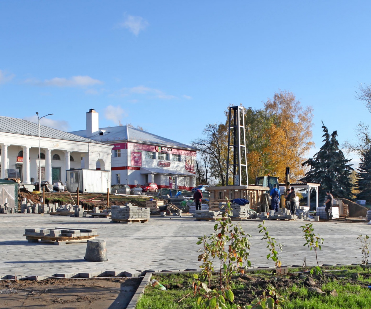 На объекте продолжаются работы по установке опор под электроснабжение. Осенью темнеет рано, и на площади установлено специальное освещение, чтобы рабочие могли трудиться в две смены и в темное время суток работы не останавливались.