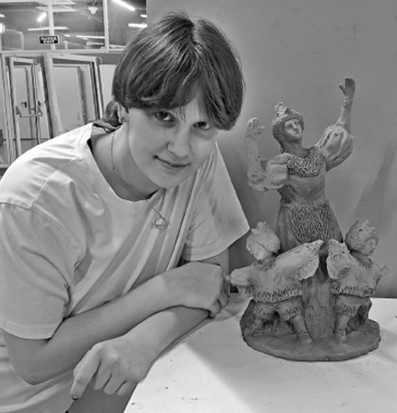 Для разминки лепили голову Венеры. Лепили в масштабе один к одному руками, детали прорабатывали инструментами - стеками, а потом со слезами на глазах рушили. Тема февральского курса - «Танец, наука и музыка». Нужно было титанически осмыслить предложенную тему и затем талантливо выразить это в своей работе. Ну, вот, композицию я придумала в виде эпизода из танцевального номера галичского хореографического ансамбля «Фортуна» - танцующей мамы Курицы с цыплятами. Сначала лепила маленькую работу – эскиз, а потом уже в задуманном размере. Но самое интересное занятие – это выполнение скульптуры головы с портретным сходством. Я никогда не лепила живого человека, но Злата - девочка с моего потока - у меня получилась неплохо.