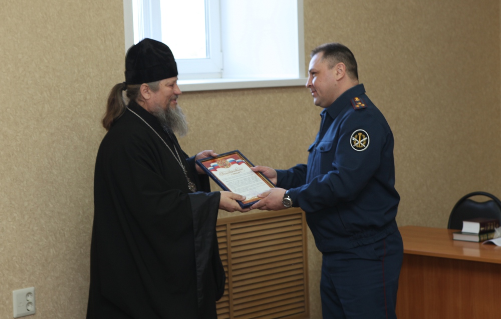 Сергей Владимирович поблагодарил всех гостей СИЗО и вручил Благодарственные письма за сотрудничество и помощь отцу Александру и главному редактору «Галичских известий» Жанне Серогодской. А ещё отметил, что в планах Управления, несмотря на трудные экономические условия, всё же есть строительство нового здания и передача помещений бывших храмов церкви.