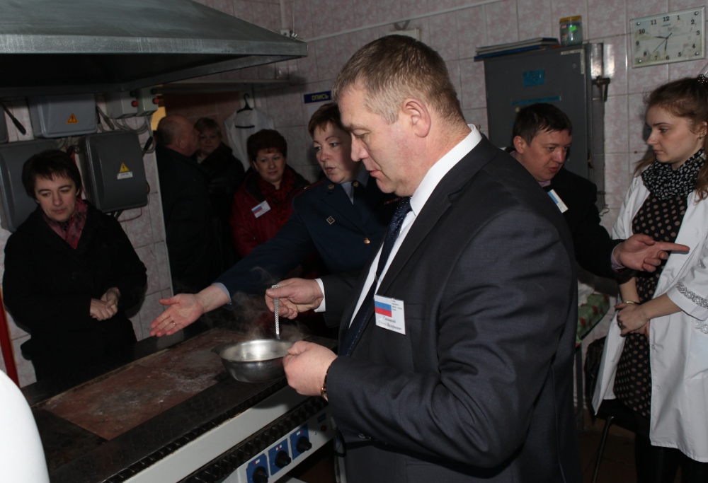 На режимной территории расположен пищеблок учреждения, который включает в себя варочный, моечный, овощной, мясо-рыбный цеха, кладовую сухих продуктов и комнату для персонала. Пищеблок оборудован современной кухонной техникой. Экскурсантов сразу сразил густой запах мясного супа. Пробу за всех снял глава города Сергей Синицкий. Все же отметили чистоту и порядок, царящие в кухонном царстве.