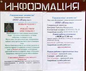 Жильцы многоквартирных домов вправе не только заказывать ремонты и согласовывать работы, но и отслеживать прохождение текущих работ.Вот уже не первый год говорят о том, что управляющие компании должны работать в открытом информационном режиме, сообщая не только текущую информацию о работе, предоставляя отчёты за год, но и полностью «раскрывая свою кухню»: когда, на что и сколько потрачено со счёта дома.Традиционно,для информирования жильцов на ежегодных общедомовых собраниях управляющие компании предоставляют отчет о проделанной работе. Однако на собрания приходят не все, многие, не имея возможности присутствовать, потом возмущаются тем, что соседи рассказали им не всё и часто не так. Управляющие компании, в свою очередь, чтобы донести информацию до каждого, вынуждены чуть ли не поквартирно обходить дом. Новинкой в общении жильцов с компанией, управляющей домом, стали в нашем городе информационные стенды в подъездах домов. Правда, пока только жильцы домов, заключивших договор с компанией «Импульс», имеют возможность прочитать на своих стендах информацию об изменении тарифов, о новом в законодательстве, расчётах за оказанные услуги и выполненные работы… Кроме того, дирекция компании и с праздниками, и даже с днями рождения поздравить своих нанимателей теперь возможность имеет, как и познакомить со своими ближайшими планами. Такой подход, хотя и несколько односторонний, всё же даёт жильцам информацию для размышления и подготовки к общим собраниям. Положительный пример собираются распространять и дальше.