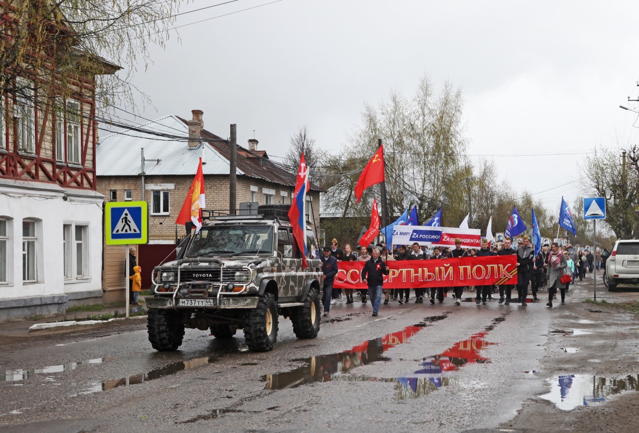 Колонна с сотнями портретов героев, начав движение ровно в 10 утра на площади Калинина, протянулась на несколько кварталов, прежде чем собраться у Вечного огня в центре Галича.