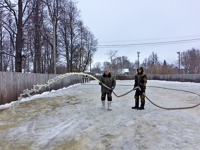 Организатор работ - руководитель спортивного сектора городской администрации и руководитель "Александра Невского" Николай Петрович Комаров. Со своими помощниками они трудятся несколько дней: площадь катка уже пролита в несколько слоев. Воду качают мотопомпой из реки Шокшанка, что течет по соседству. Мощный насос молодежному центру предоставил индивидуальный предприниматель Сергей Медведев.