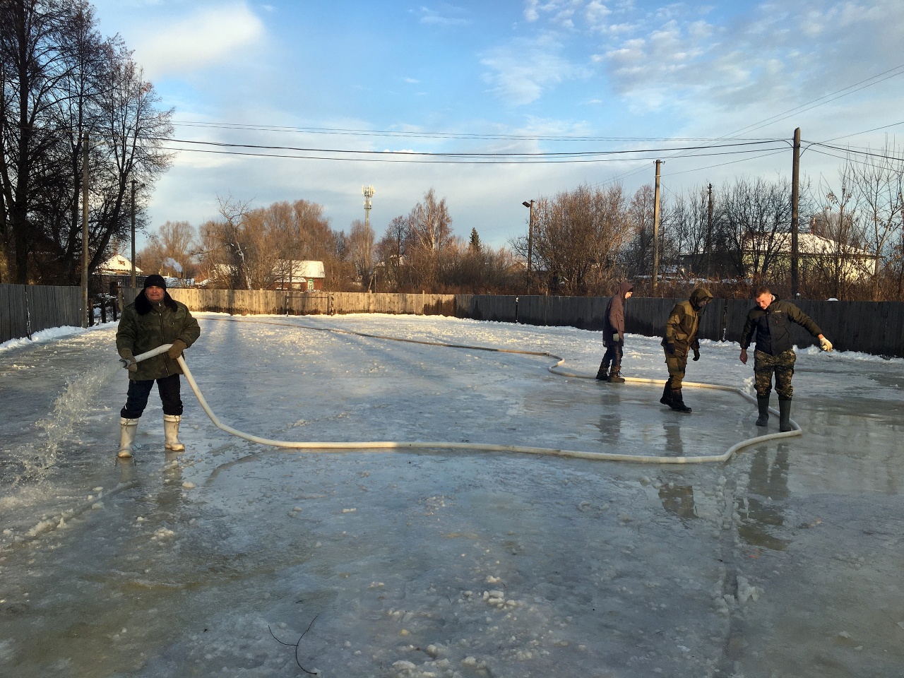 Работа идет уже несколько дней: чтобы получить гладкий, прочный лед, нужно залить и выровнять несколько слоев. Руководит подготовкой ледяного поля Николай Петрович Комаров, заведующий городским сектором спорта и «глава» местных подростков, участников военно-патриотического объединения «Александр Невский». Бывшие подопечные Николая Петровича, «выпускники» объединения, и здесь – его главные помощники. Николай Хватков, Константин Амур, Олег Смирнов и Алексей Носов откликнулись на просьбу Николая Петровича без лишних уговоров.