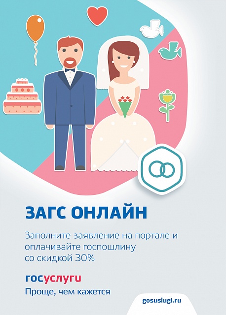 Хочешь быстро подать заявление на регистрацию брака и сэкономить свадебный бюджет. В помощь молодоженам – портал Госуслуг, который позволяет выбрать удобную дату и время церемонии бракосочетания и получить приятный бонус – 30% скидку на госпошлину.