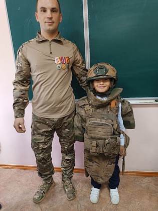 Ребята пообщались с военнослужащим Александром, который сейчас находится в отпуске. Он отец Алисы Зеленовой - обучающейся 1 класса. Участник специальной военной операции рассказал школьникам о своей службе.