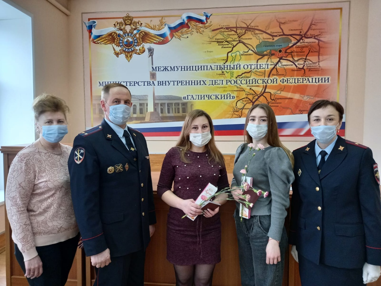 Сотрудники отделения по вопросам миграции, группы по работе с личным составом, члены Общественного совета при МО МВД России «Галичский» поздравили их с наступающим праздником. В адрес прекрасных дам прозвучали теплые пожелания с началом нового этапа в жизни - семейной жизни, так как паспорта девушки получали в связи с вступлением в брак.