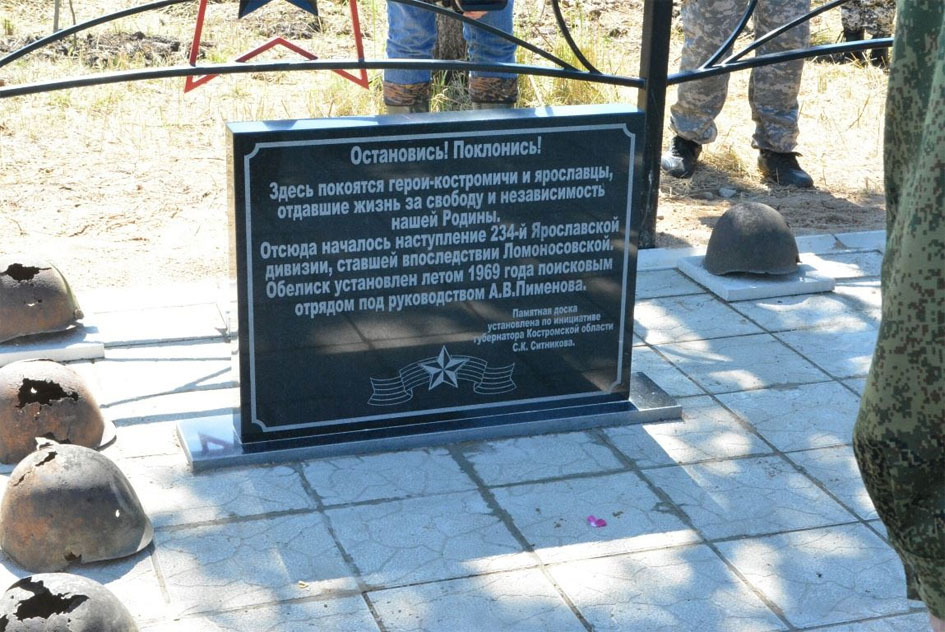 Здесь установлена памятная доска, которая гласит о подвиге костромичей и ярославцев, отдавших жизнь за свободу и независимость Родины.