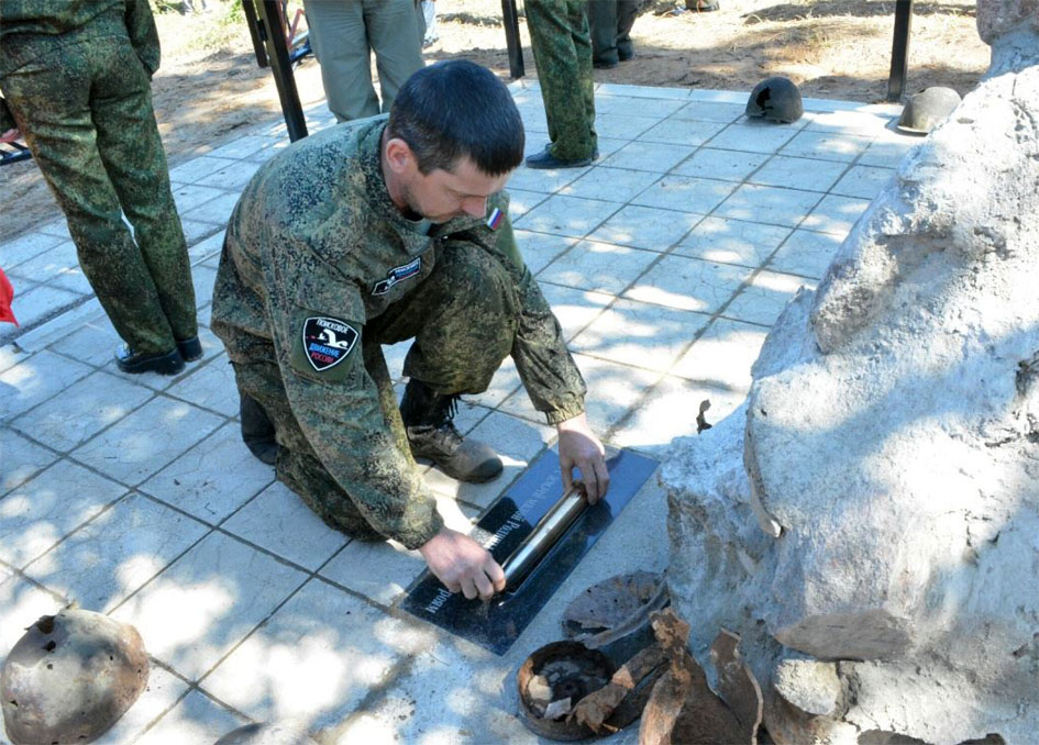 Председатель костромского регионального отделения Всероссийской общественной организации «Поисковое движение России» Сергей Шиянов передал Сергею Ситникову холщовый мешочек с землей с мест боев 1350-го полка 234-й стрелковой дивизии.