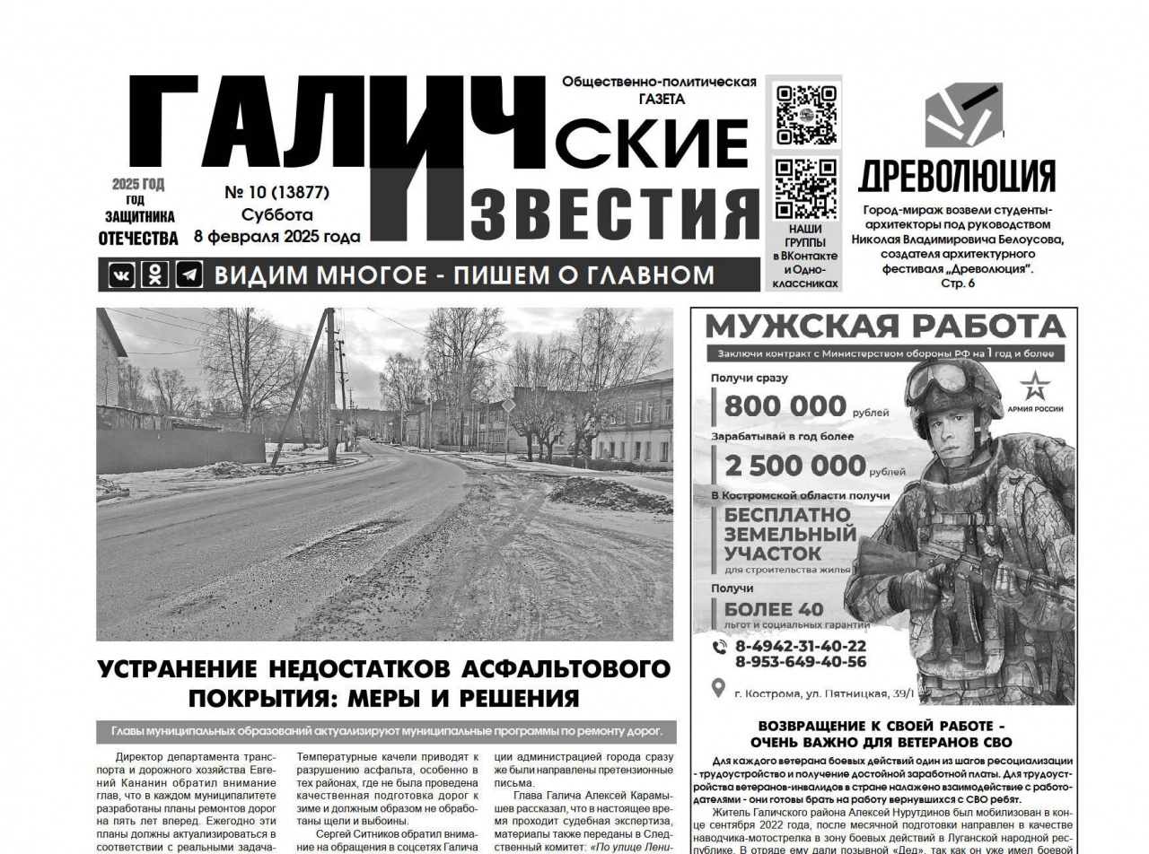 8 февраля выйдет очередной номер (№ 10) газеты «Галичские известия». Что интересного? Читайте в этом номере газеты: Город-мираж возвели студенты-архитекторы под руководством Николая Владимировича Белоусова, создателя архитектурного фестиваля «Древолюция». Стр. 6