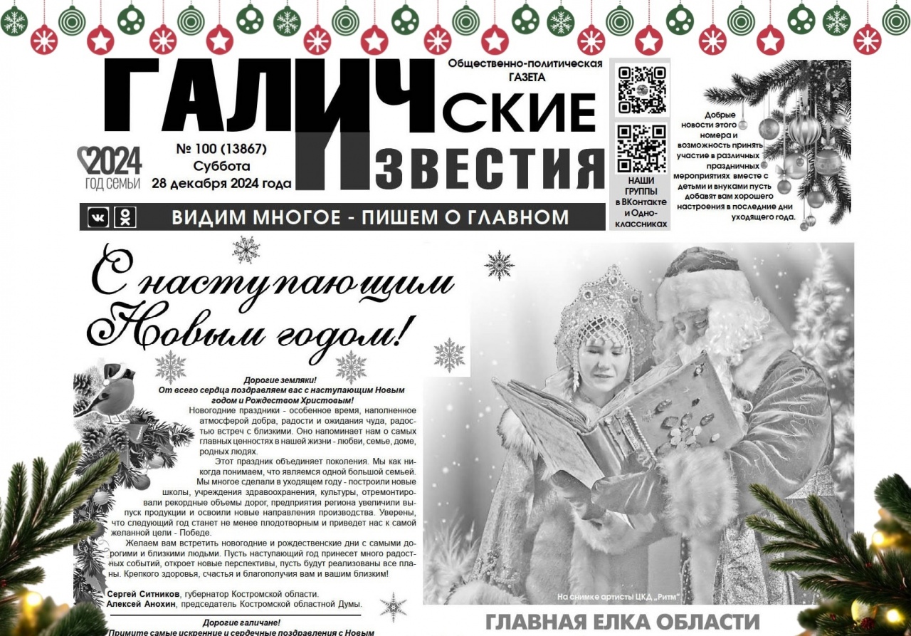 28 декабря выйдет очередной номер (№100) газеты «Галичские известия». Что интересного? Читайте в этом номере газеты: Добрые новости этого номера и возможность принять участие в различных праздничных мероприятиях вместе с детьми и внуками пусть добавят вам хорошего настроения в последние дни уходящего года.