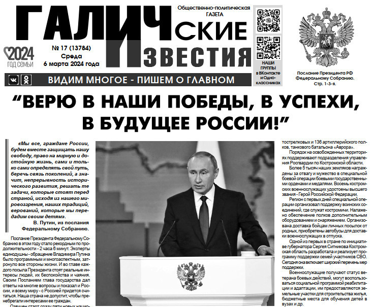 06 марта вышел очередной в 2024 году номер (№17) газеты "Галичские известия". Что интересного? Читайте в этом номере газеты: