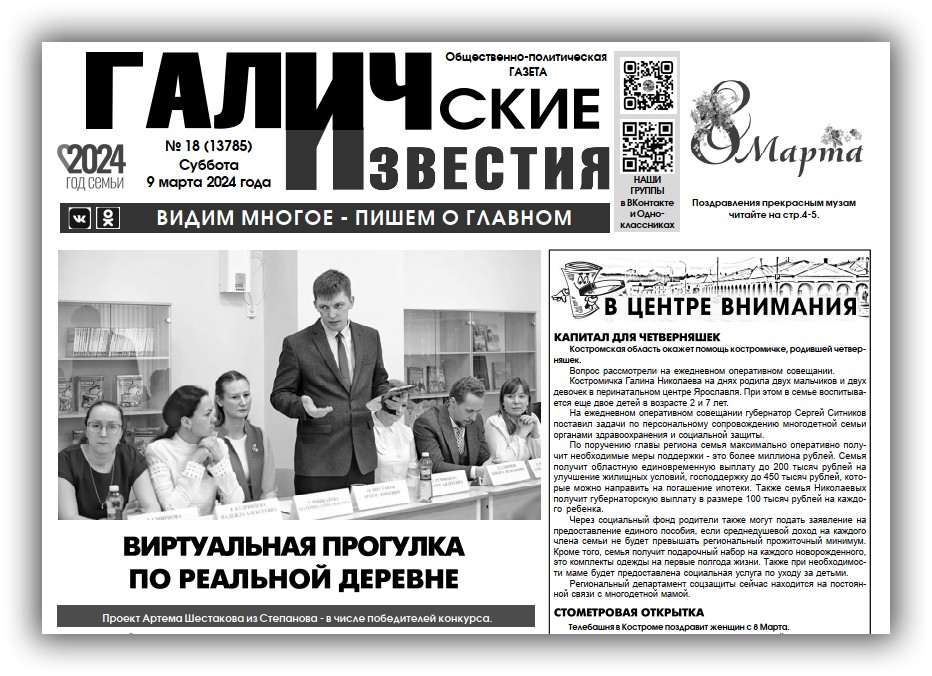 09 марта вышел очередной в 2024 году номер (№18) газеты "Галичские известия". Что интересного? Читайте в этом номере газеты: