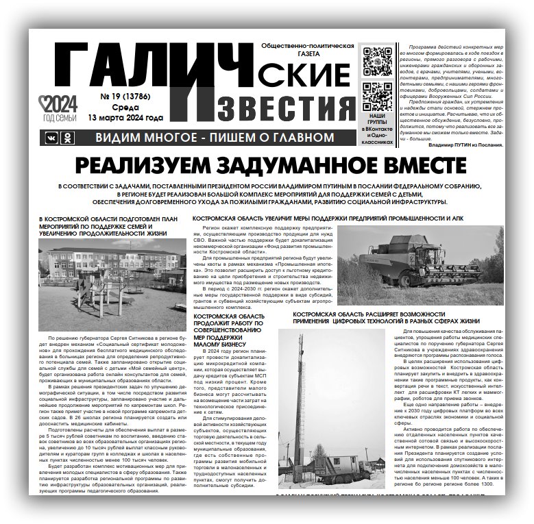 13 марта вышел очередной в 2024 году номер (№19) газеты "Галичские известия". Что интересного? Читайте в этом номере газеты: