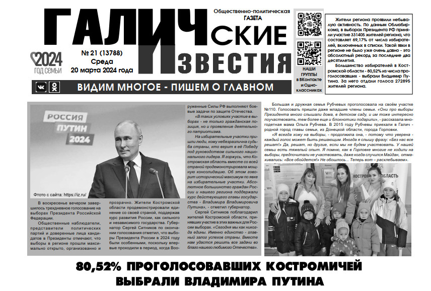 20 марта вышел очередной в 2024 году номер (№21) газеты "Галичские известия". Что интересного? Читайте в этом номере газеты: