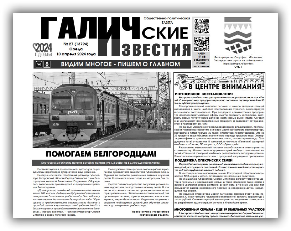 10 апреля вышел очередной в 2024 году номер (№27) газеты "Галичские известия". Что интересного? Читайте в этом номере газеты: