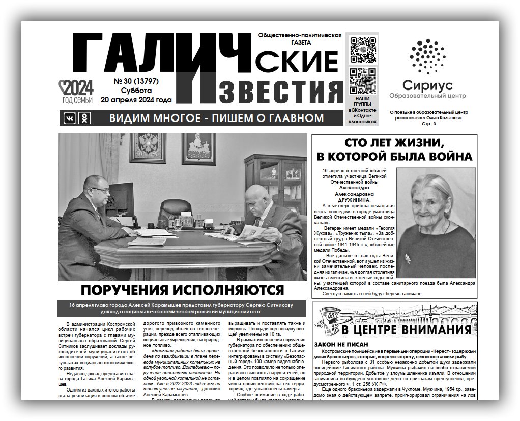 20 апреля вышел очередной в 2024 году номер (№30) газеты "Галичские известия". Что интересного? Читайте в этом номере газеты: