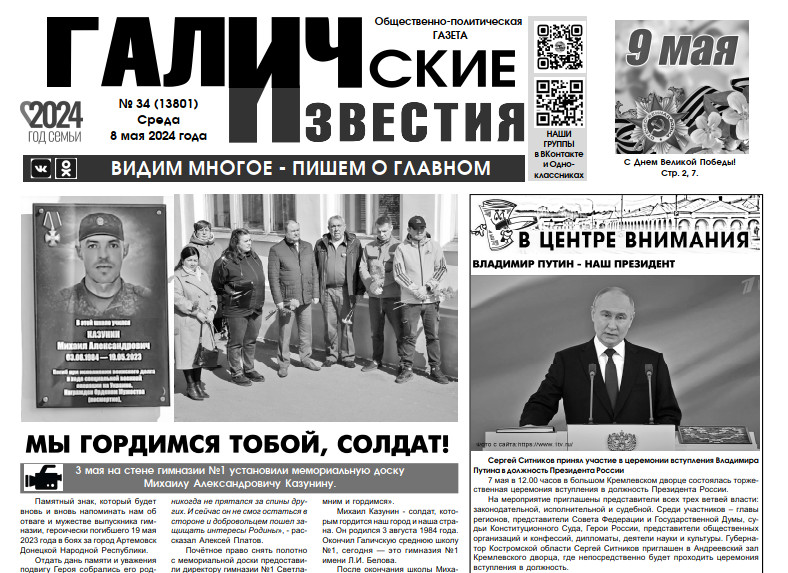 08 мая вышел очередной в 2024 году номер (№34) газеты "Галичские известия". Что интересного? Читайте в этом номере газеты:
