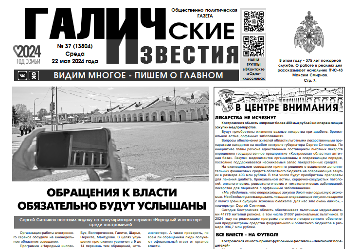 22 мая вышел очередной в 2024 году номер (№37) газеты "Галичские известия". Что интересного? Читайте в этом номере газеты:
