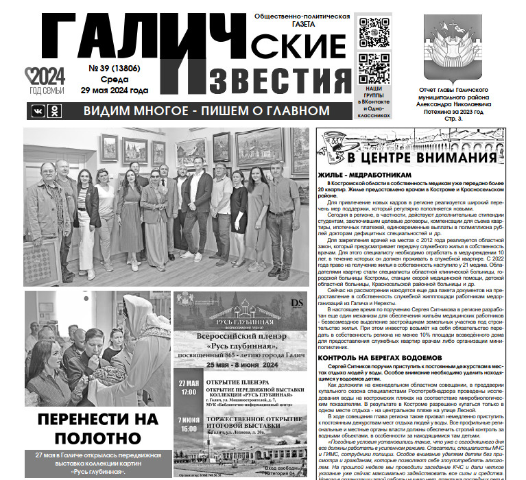 29 мая вышел очередной в 2024 году номер (№39) газеты "Галичские известия". Что интересного? Читайте в этом номере газеты:
