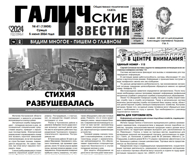 05 июня вышел очередной в 2024 году номер (№41) газеты "Галичские известия". Что интересного? Читайте в этом номере газеты: