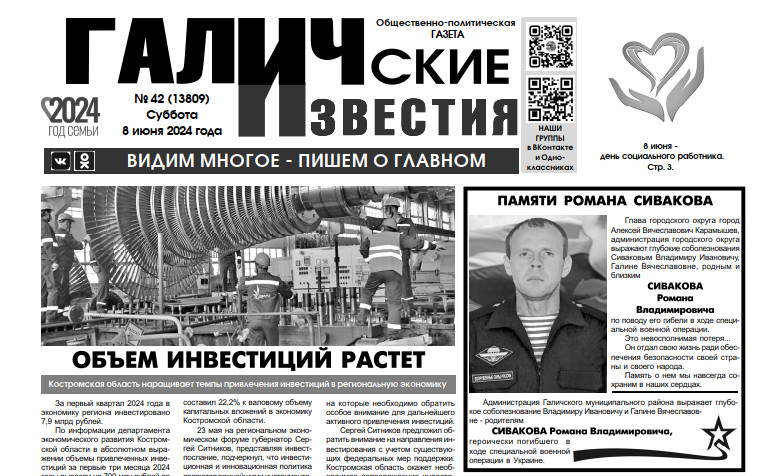 08 июня вышел очередной в 2024 году номер (№42) газеты "Галичские известия". Что интересного? Читайте в этом номере газеты: