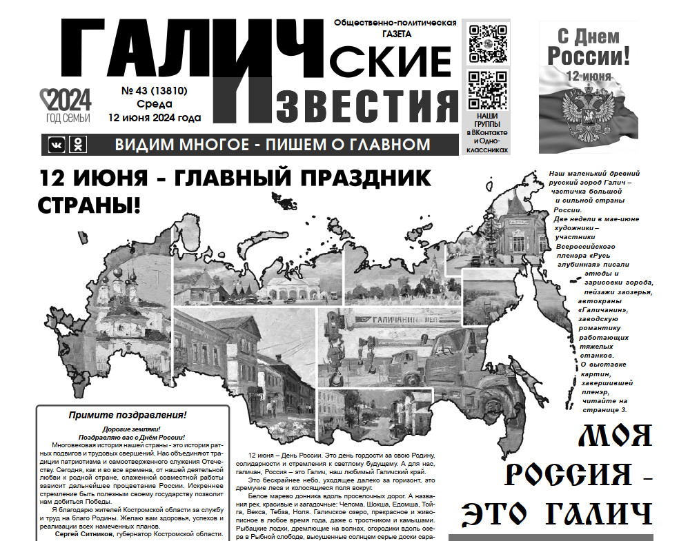 12 июня вышел очередной в 2024 году номер (№43) газеты "Галичские известия". Что интересного? Читайте в этом номере газеты: