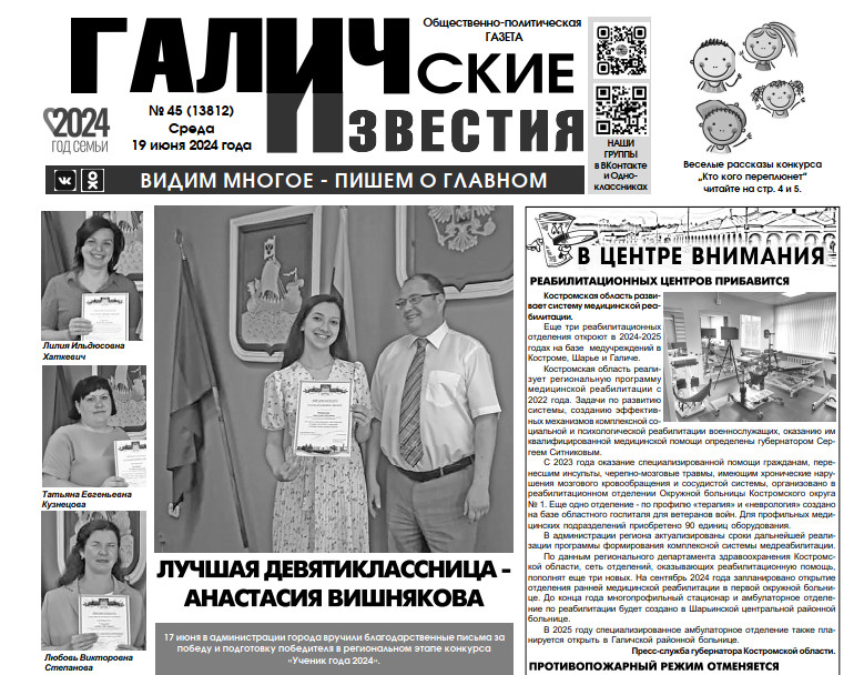19 июня вышел очередной в 2024 году номер (№45) газеты "Галичские известия". Что интересного? Читайте в этом номере газеты: