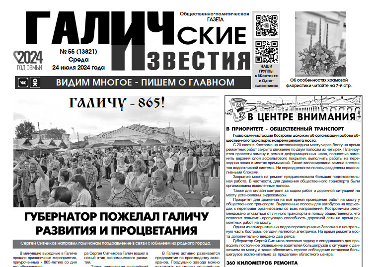 24 июля вышел очередной в 2024 году номер (№55) газеты "Галичские известия". Что интересного? Читайте в этом номере газеты: