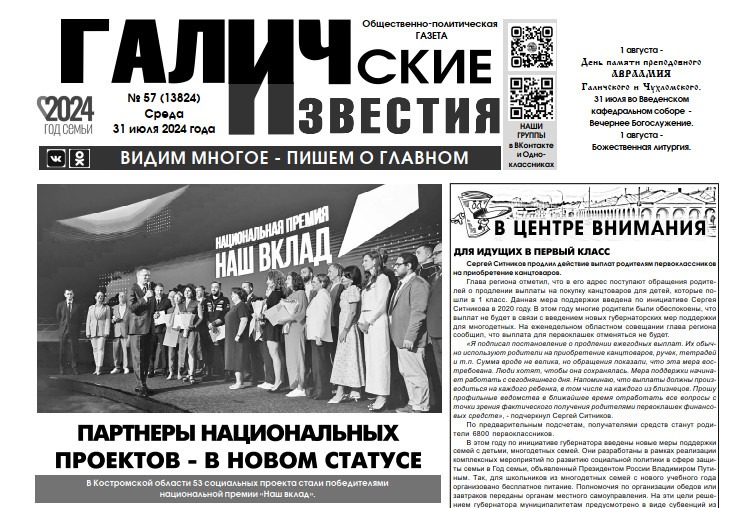 31 июля вышел очередной номер (№57) газеты "Галичские известия". Что интересного? Читайте в этом номере газеты: