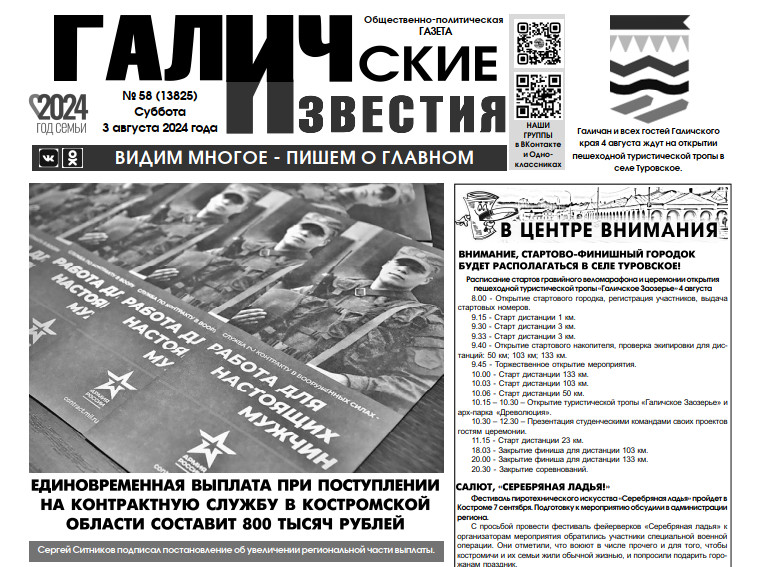 1 августа вышел очередной номер (№58) газеты "Галичские известия". Что интересного? Читайте в этом номере газеты: