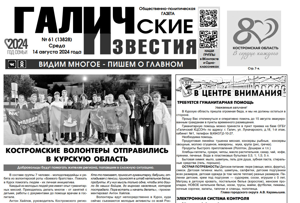 14 августа вышел очередной номер (№61) газеты "Галичские известия". Что интересного? Читайте в этом номере газеты: