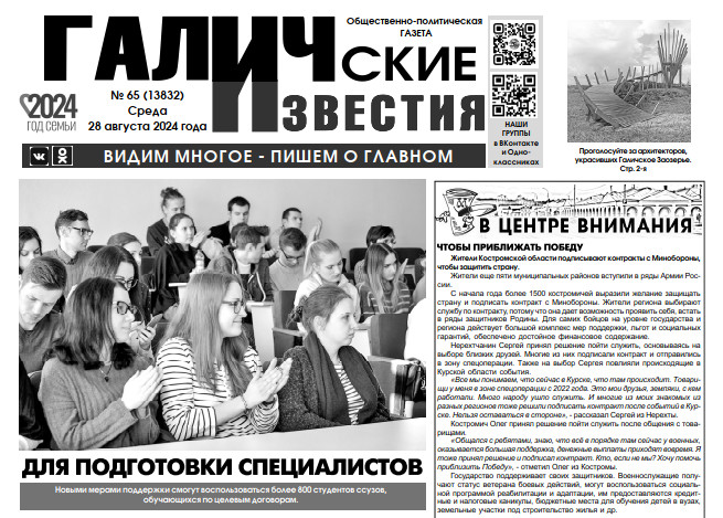 28 августа вышел очередной номер (№65) газеты "Галичские известия". Что интересного? Читайте в этом номере газеты: