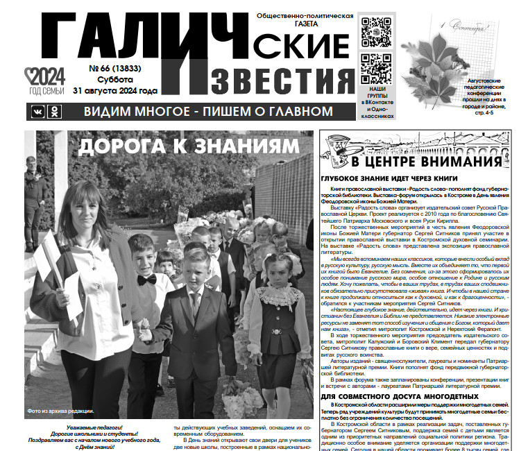 31 августа вышел очередной номер (№66) газеты "Галичские известия". Что интересного? Читайте в этом номере газеты: