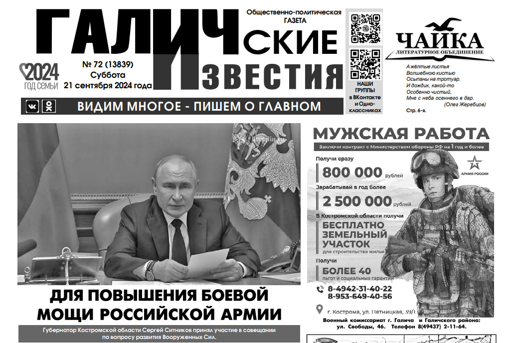 21 сентября вышел очередной номер (№72) газеты "Галичские известия". Что интересного? Читайте в этом номере газеты: